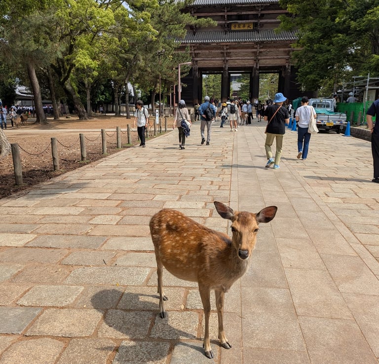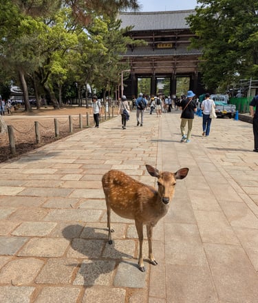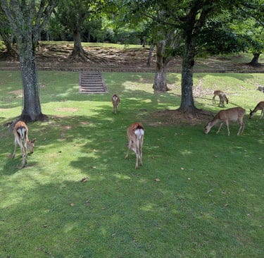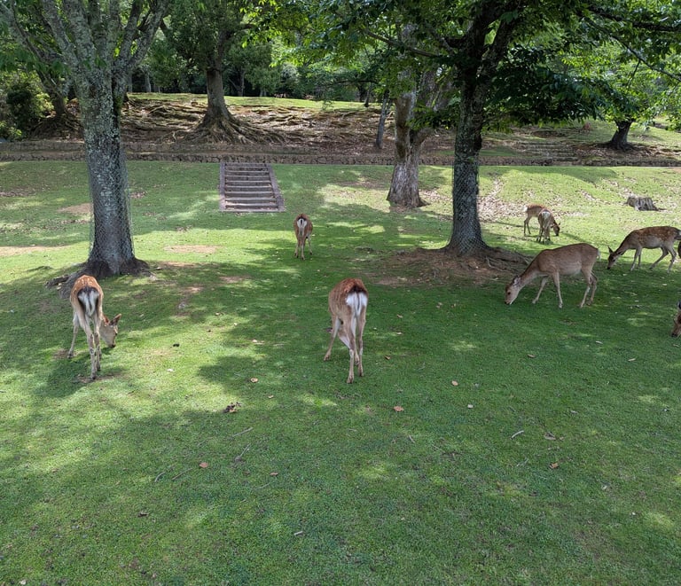 Schon beim Ankommen im Nara Park wirst du von den berühmten Rehen begrüßt. Sie gelten als heilig und bewegen sich frei im Park.